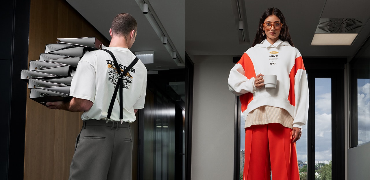 Alfa i omega naszego bloga (no i oczywiście sigma, a co): sneakersy. Jak łączyć je z office style? Wszystko zależy od tego, jaki efekt chcesz osiągnąć. Idziesz w klasykę tak bardzo, że na słuchawkach masz „The Wall” Pink Floyd, a na tapecie służbowego laptopa „Mona Lizę”? Buty dla Ciebie to oczywiście białe lub czarno-białe retro sneakersy. Jeśli czujesz, że czas rozświetlić trochę własny outfit i mroki open space, postaw na wyraziste buty ze srebrnymi lub złotymi detalami – znajdziesz je m.in. w kolekcji New Balance. Na nudnych statusach możesz założyć nogę na nogę i puszczać zajączki w oczy prowadzącego (ale jak Cię przyłapie kadra zarządzająca, to nie mieliśmy z tym nic wspólnego). Odwołano owocowy czwartek? Na pociechę wybierz koszykarskie ejtisowe sneakersy takie jak Nike Dunk. Te soczyste kolory zastąpią Ci nieobecne pomarańcze, kiwi czy jabłka. Uprzedzając pytania: nie, nie mamy kamery zainstalowanej w Waszym biurze. Po prostu znamy się na życiu. I na marynarkach. Oraz oczywiście na sneakersach.